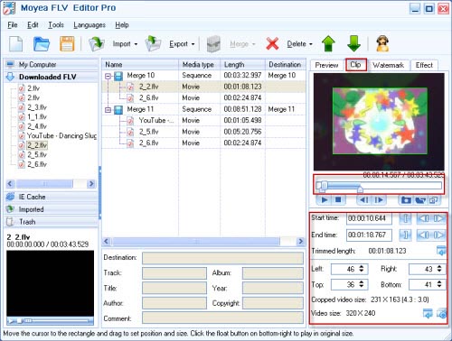 Drag FLV from “Downloaded FLV” tab to the sequence list. You can select more than one video clip to join FLV files by clicking “Merge” button.